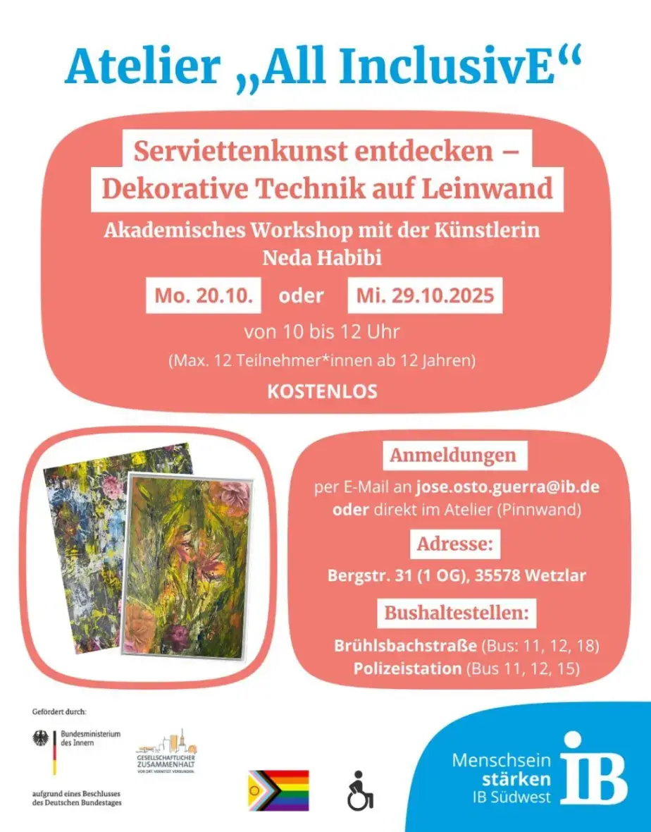 Event On this page, I share updates about all painting and art workshops offered by Habibi Art Gallery. I'd love to have you join! Atelier “All InclusivE” – Discover Napkin Art – Decorative Technique on Canvas Artist: Neda Habibi Date: 📅 Wednesday, October 29, 2025 📅 Monday, October 20, 2025 Time: 🕙 10:00 AM – 12:00 PM Address: 📍 Bergstr. 31 (1st Floor), 35578 Wetzlar, Germany Organizer: iB Wetzlar & Habibi Art Gallery Cost: 💸 Free of charge THE WORLD OF COLORS AND TEXTURES artist: Neda Habibi Date: Wed., March 26, 20252 p.m. to 4 p.m. (Max. 10 participants ages 12 and up)Address: Bergstr. 31 (1. OG.), 35578 Wetzlar free